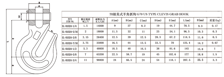 1、特点:高强度优质合金钢模锻。 2、适用于和70级索具配件配合使用。 3、制造检测拉力为额定载荷的2倍。以额定载荷的1.5倍,抽样做20000次的循环疲劳测试。 4、100%进行磁粉探伤。